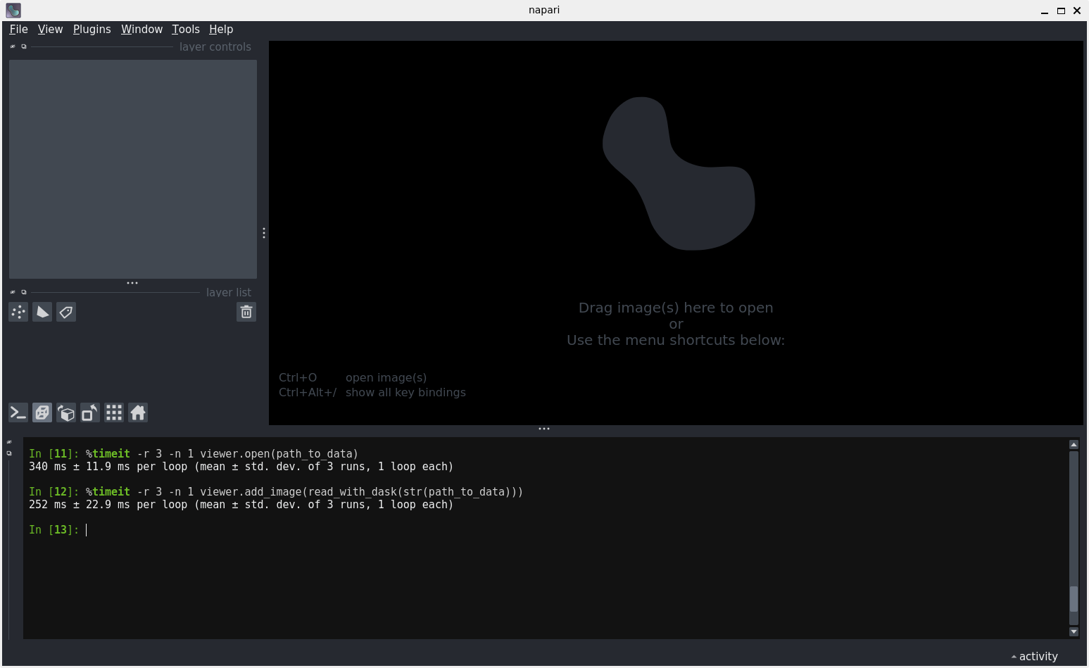 %timeit -r 3 -n 1 viewer.add_image(read_with_dask(str(path_to_data)))After following along, your screen should look something like: