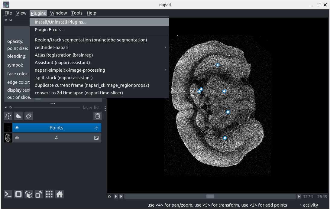 Plugins > Install/Uninstall plugins...brainrender-napariInstall buttonnapariPlugins > Brainrender (brainrender-napari)After following along, your screen should look something like:
